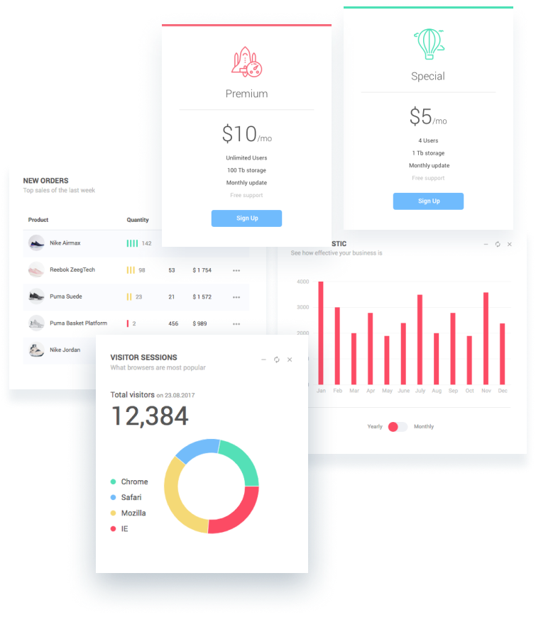 We've created the multipurpose admin panel which allows to create a dashboard for the different business area. There is a bunch of elements for the creation of unique blocks and widgets.
